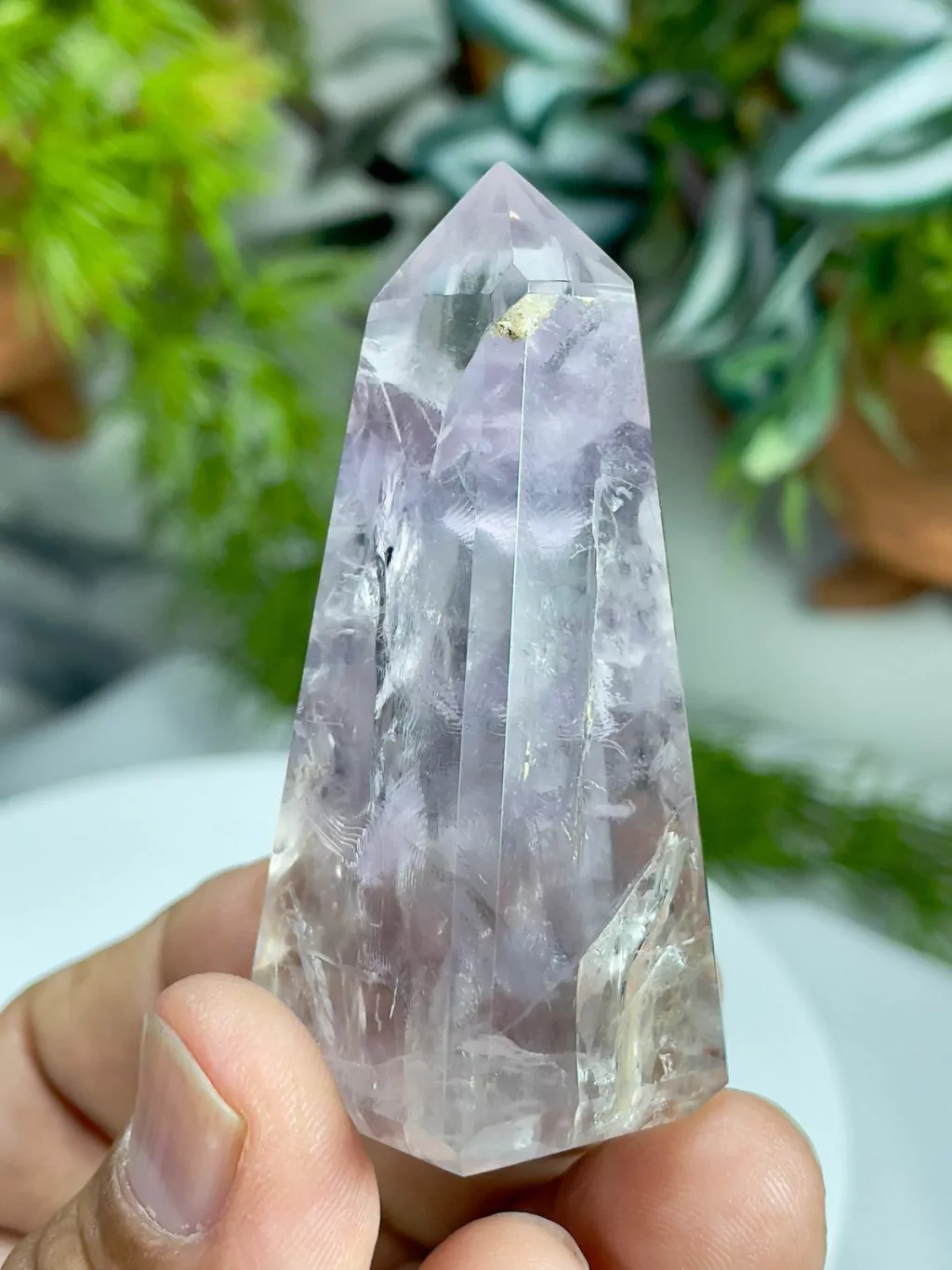 Uma verdadeira obra-prima da natureza, este Obelisco Natural Lapidado e Polido de Cristal de Quartzo Ametista Transparente combina beleza, energia e sofisticação. Suas inclusões únicas de Arco-íris e Folhas Prateadas Internas tornam cada peça um espetáculo exclusivo, irradiando vibrações transformadoras.